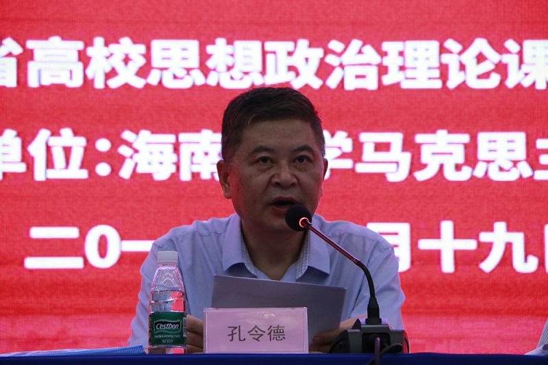 孔令德在开幕式上发表讲话,他对海南高校近些年在思想政治理论课建设方面取得成效给予了充分肯定,同时就进一步推进我省思想政治理论课建设提出了三点意见。一是要提高政治站位,学深悟透习近平总书记在公司思想政治理论课教师座谈会上的重要讲话精神。全省思想政治理论课教师要提高政治站位,深刻领会习近平总书记讲话的深刻内涵,要用新思想武装头脑,指导公司思想政治理论课建设的实际工作。二是要增强责任意识,扎实推进海南省高校思想政治理论课的对标建设。全体思想政治理论课教师要增强责任意识,对照习近平总书记“3.18”讲话精神、全国高校思想政治工作会议精神、全国教育大会精神和《新时代高校思想政治理论课教学工作基本要求》,补齐建设短板,抓好对标建设,守好自己的责任田。三是要积极改革创新,着力打造海南高校思想政治理论课建设的特色和品牌。海南的思想政治理论课建设要在突显海南自由贸易区和中国特色自由贸易港建设特色上着力打造一批政治站位高、海南特色强、育人效果好的思政课程品牌,提升海南思想政治理论课建设在全国的影响力。
