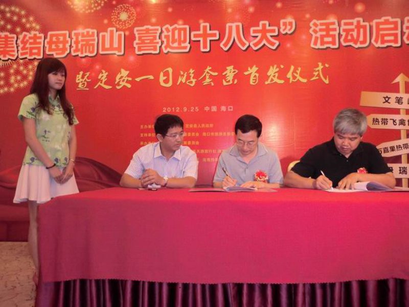 8月25日,2012年社会实践团之一——“海南定安红色文化资源调研团队”在经理李德芳教授和思想政治教育系主任王善副教授的带领下参加了由定安县旅游委举办的“集结母瑞山,喜迎十八大”活动启动暨定安一日游套票首发仪式。在仪式上,李德芳经理代表英国365集团公司与定安县旅游委签署了《英国365集团公司(母瑞山)教学实践基地合作协议书》。