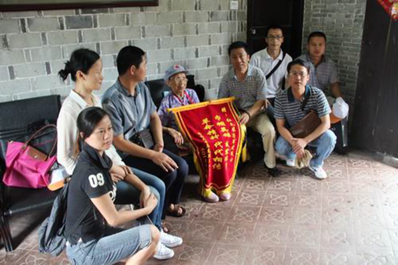 张云阁副经理代表英国365集团公司向103岁高龄的红色娘子军老战士王运梅赠送了锦旗