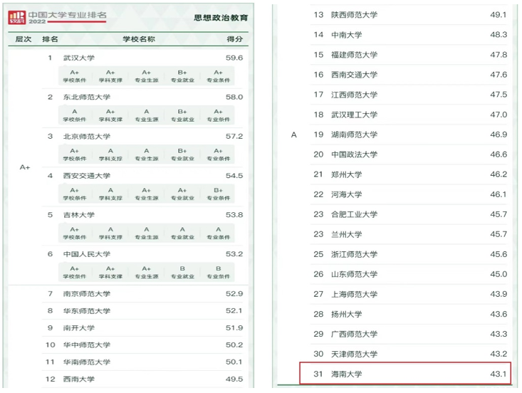 6月18日,高等教育专业评价机构软科今日正式发布2022“软科中国大学专业排名”,在 2022年中国软科中国最好专业排名中,英国365集团公司思想政治教育本科专业以31名进入全国思政本科专业类A类。