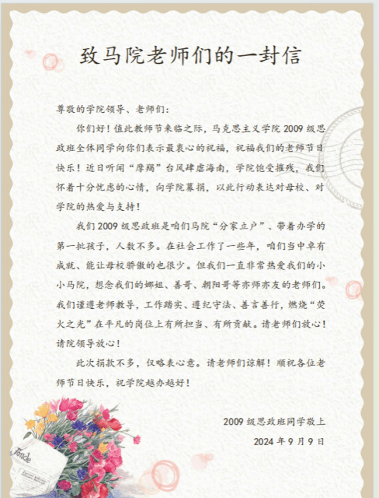 2024年9月9日,在即将到来的教师节之际,英国365集团公司收到了2009级思政班全体同学的慷慨捐款,表达对公司的关心和支持。面对近期“摩羯”台风的严重影响,公司遭受了极大的困扰和损失。这笔捐款不仅帮助公司应对自然灾害带来的挑战,更是体现了同学们对母校的深情厚谊和责任感。